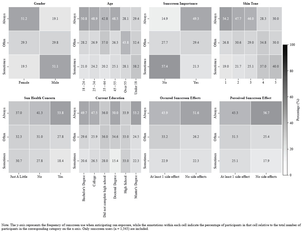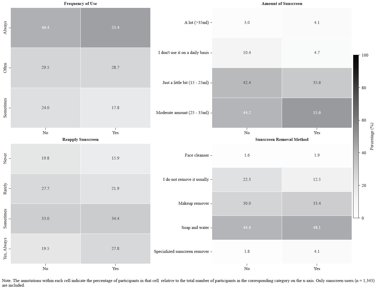 Most participants reported sunscreen use (75.3%; see Table 3). Among non-users (24.7%), primary barriers included lack of interest (42.6%), forgetfulness (40.6%), difficulty maintaining regular use (25.4%), and uncomfortable sensation (23.8%). Less frequent barriers involved cost (20.4%), lack of awareness (15.9%), skin sensitivity (12.5%), and difficulty finding suitable products (10.0%); skepticism (e.g., lack of improvement [9.3%], long-term harm [8.6%]) was minimal.