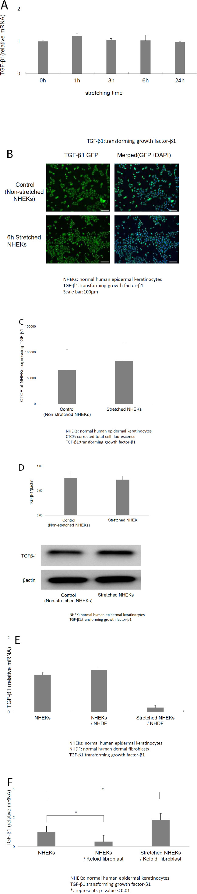 A) Mechanical stretching did not affect transforming growth factor (TGF)-β1 mRNA levels in NHEKs. B) Immunofluorescence microscopy revealed that TGF-β1 expression in NHEKs did not increase following mechanical stretching. C) CTCF of stretched NHEKs expressing TGF-β1 showed no significant differences compared with non-stretched NHEKs. D) Western blotting also revealed that mechanical stretching did not affect TGF-β1 expression in keratinocytes. E) Mechanical stretching suppressed TGF-β1 mRNA level in NHEKs co-cultured with normal dermal fibroblasts, but no significant difference was observed. F) Mechanical stretching considerably increased TGF-β1 mRNA levels in NHEKs co-cultured with keloid-derived fibroblasts.