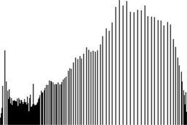 The term preprocessing in lesion image diagnostic procedures usually encompasses lesion image enhancement, image restoration with neighbourhood pixels and artefact removal [197]. The conditions surrounding the acquisition of lesion images generally influence possible discriminating features that can be extracted from such images for the purpose of automated diagnosis. Rahman et al. [198] reasoned that retrieval and the classification tasks of lesion could be challenging when images collected from separate data sets are captured by different devices under varying conditions (such as lightening). This creates a non-uniform illumination pattern, thus confusing diagnostic procedures. Colour calibration of image acquisition device has been one of the approaches proposed in the literature to resolve such challenges [199-205]. Low contrast of lesion images could also make isolation of lesion a very difficult task [206]. Abbas et al. [195] proposed enhancing lesion image contrast by adjusting and mapping the intensity values of the lesion pixels in the specified range in CIE L*a*b colour space. One major flaw of contrast enhancement is over amplification of noise in the region having relatively small intensity range. The use of Contrast Limited Adaptive Histogram Equalization (CLAHE) might be applied to address such limitations [207, 208]. (Figs. 2 and 3) respectively illustrate the normal and filled histogram of the image shown in (Fig. 4 and 5) shows an equalized histogram of the same image in (Fig. 4) for better noise removal resolution.