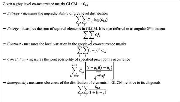 Co-occurrence texture descriptors such as entropy, correlation, energy, contrast, homogeneity etc. are based on co-occurrence matrices, typically the GLCM. (Fig. 9) detailed some of the frequently used texture descriptors, as well as corresponding computation. The GLCM [348] also known as greylevel spatial dependence matrix, is a form of statistical method of examining texture in relation to image pixels. GLCM outlines within a grey scale image, the probability of greylevel ἱ occurring at a distance in direction θ from grey level ĵ.